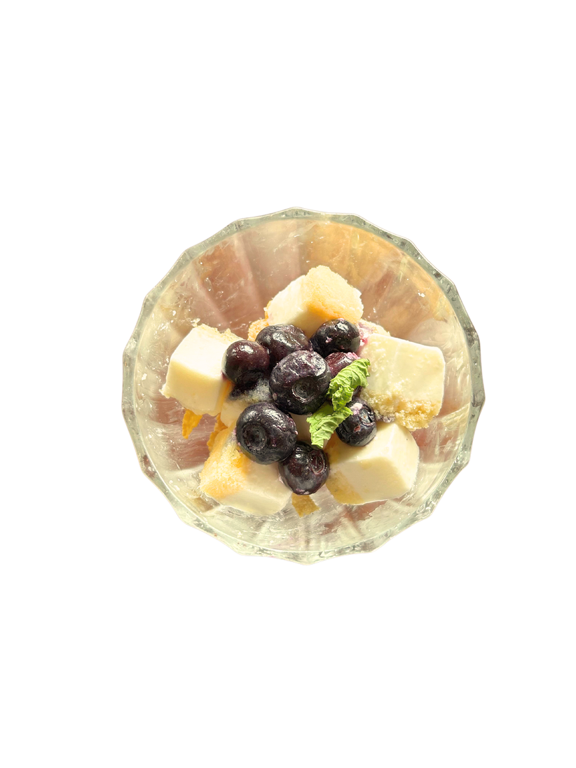 ひと口サイズのキューブチーズケーキにブルーベリーを添えた一品です。